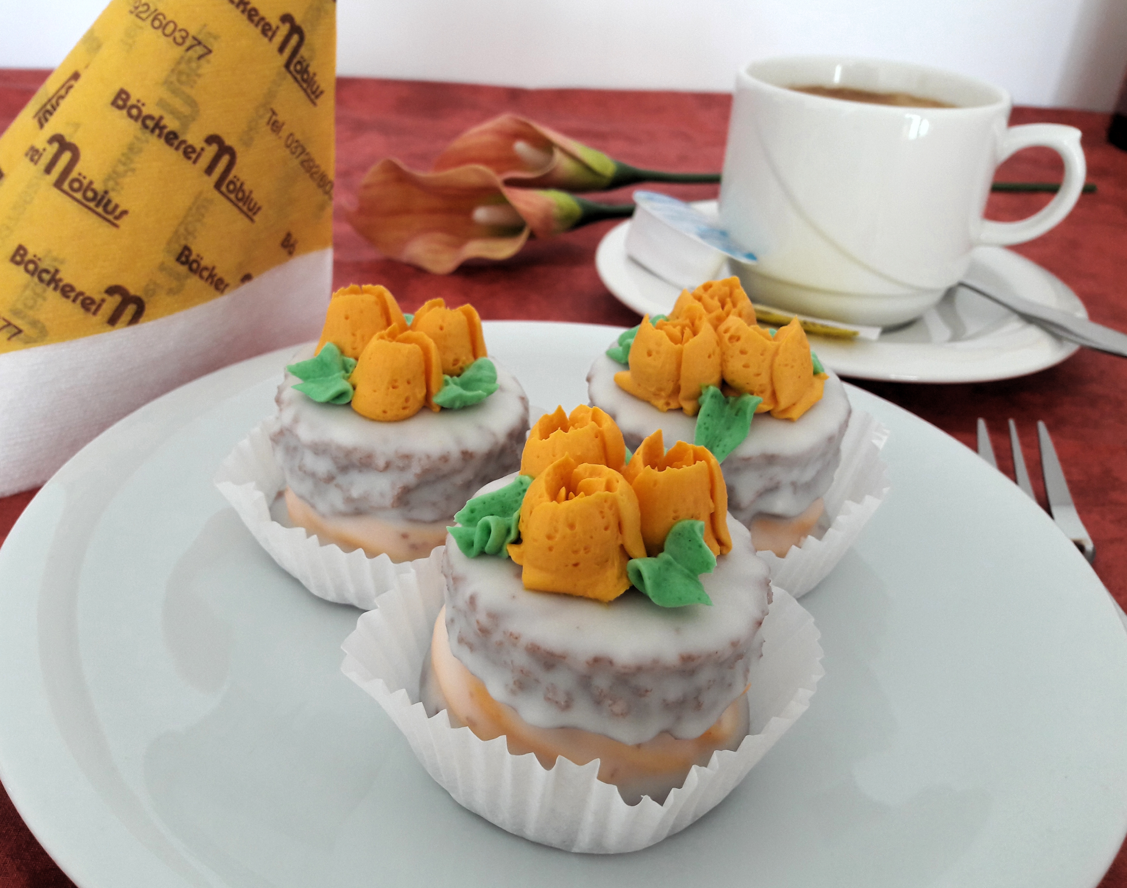 Schoko-Biskuitschichten mit Orangen-Butterkrem und Orangenfruchtfüllung zusammen gesetzt, und mit weißer Fettglasur überzogen. Die Blüte aus Butterkrem garnieren wir von Hand auf.