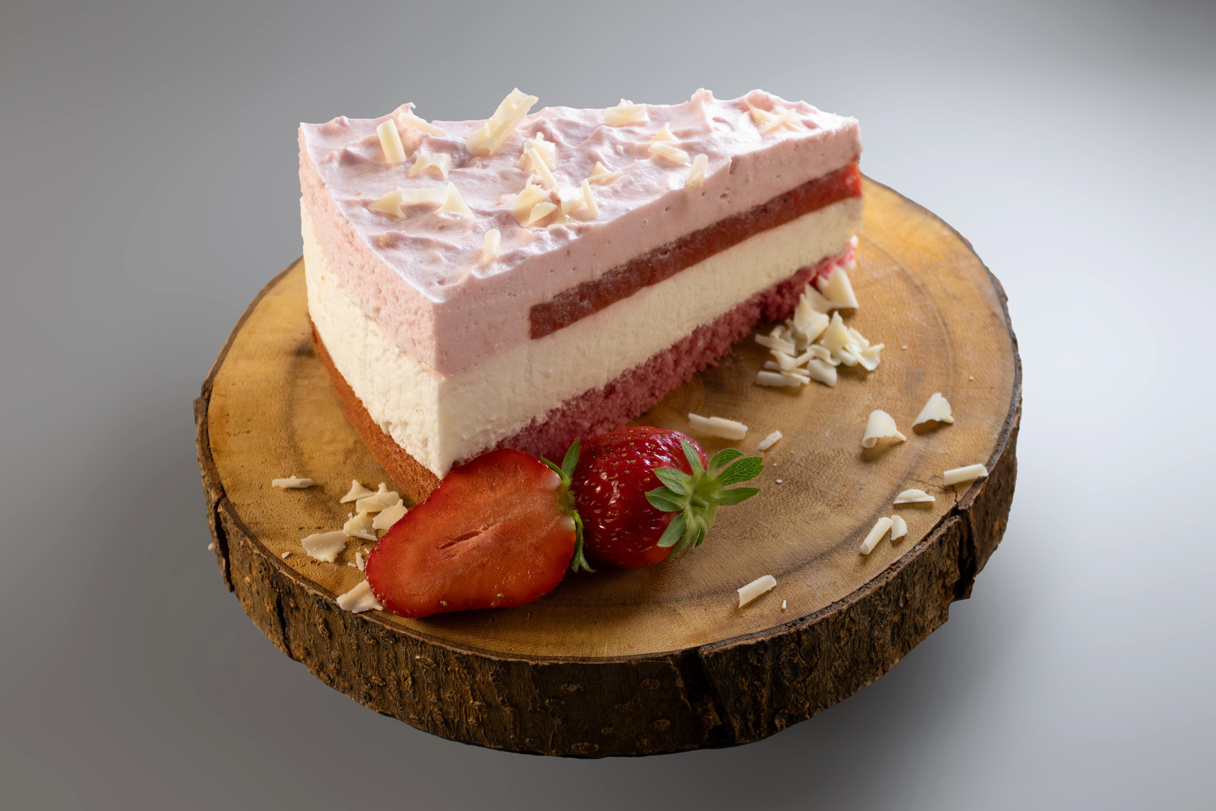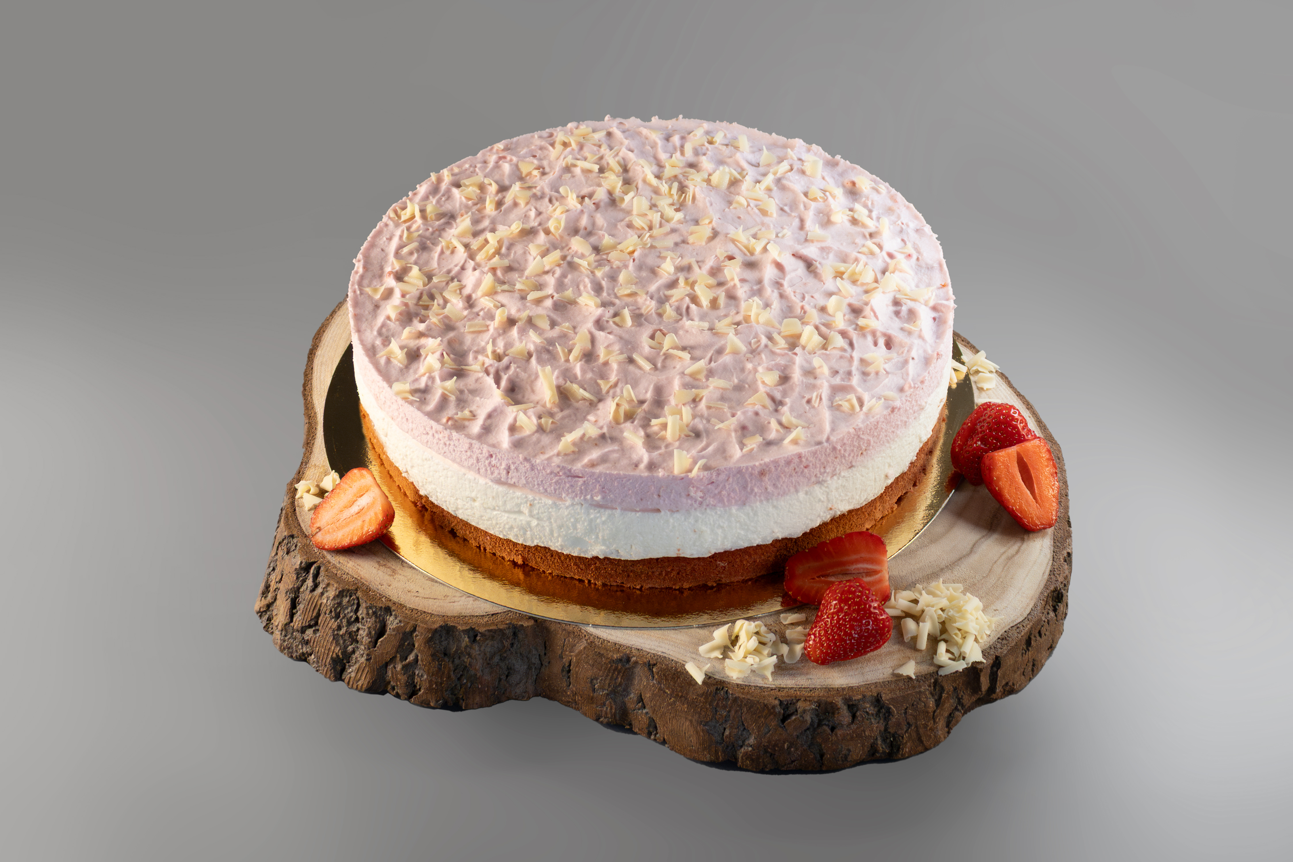 Sahnetorte bestehend aus einem rosa Biskuitboden, darüber eine Schicht weiße Schokosahne und eine Schicht Erdbeersahnesahne mit fruchtiger Füllung. Oberfläche mit weißen Schokospänen verziert.
