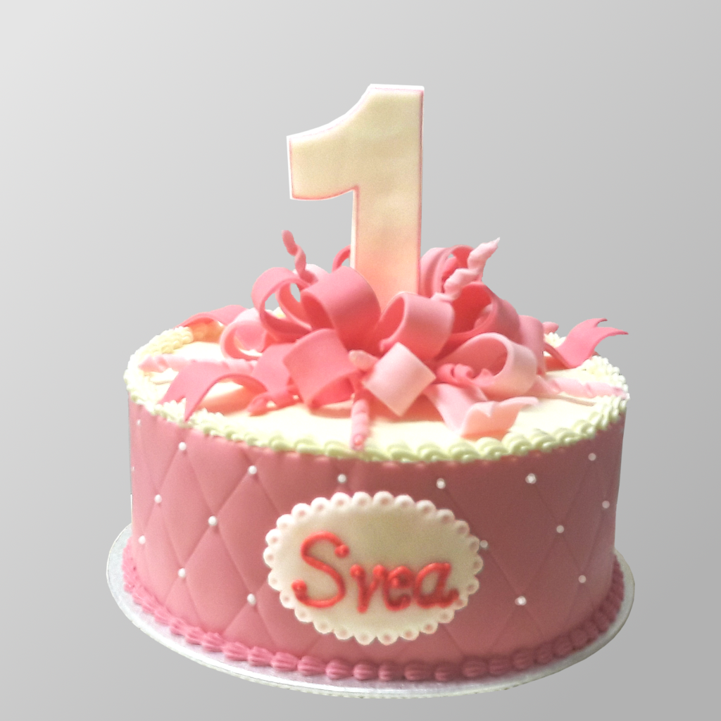 Das breite Band aus Rollfondant, an der Seite der Torte, wurde im Steppmuster geprägt und mit Silberperlen verziert. Oben auf der Torte haben wir Bänder aus Rollfondant zu einer großen Pompom-Schleife arrangiert.