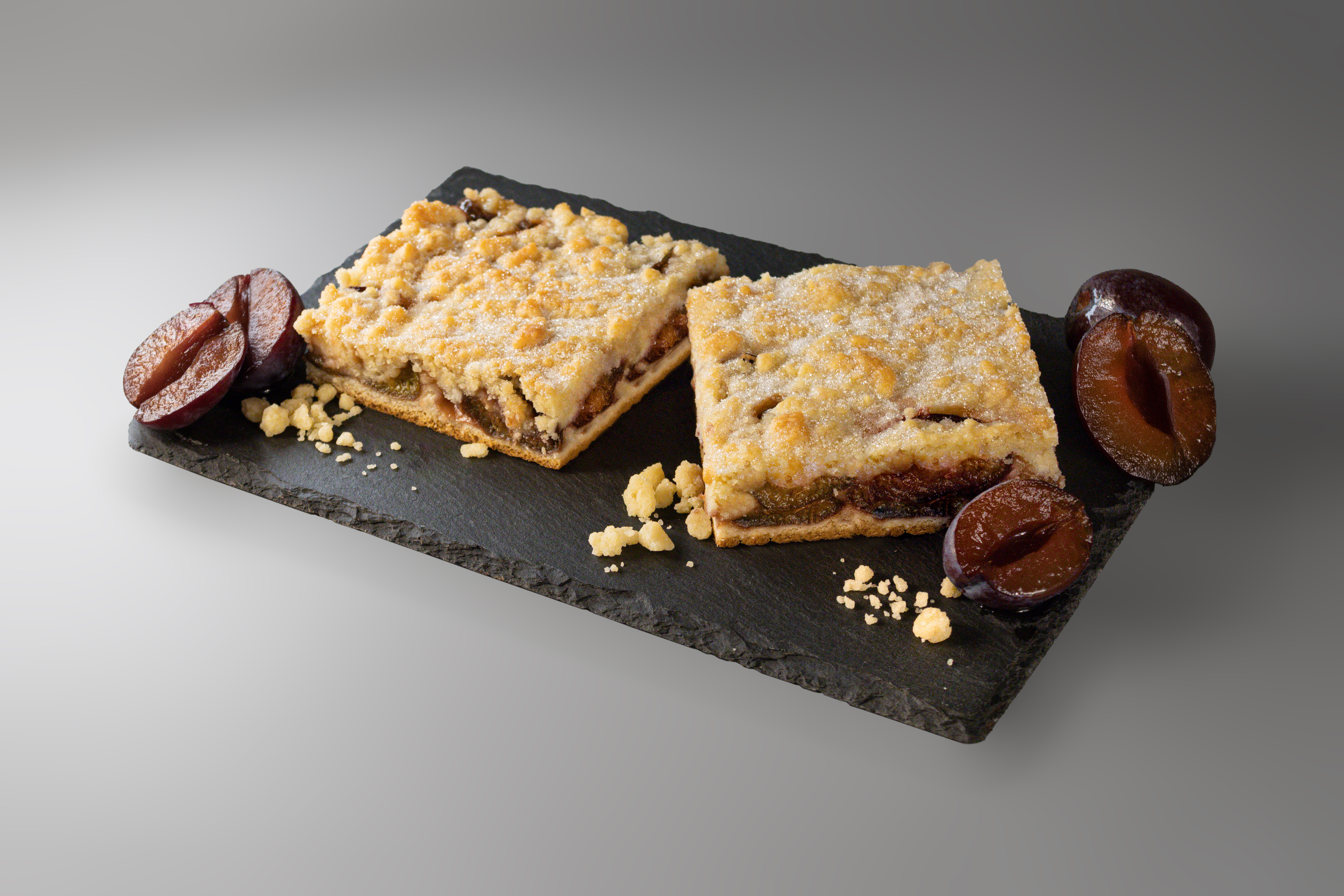 Ein dünner Hefefeinteigboden wird mit saftigen Pflaumen und reichlich Butterstreusel belegt.