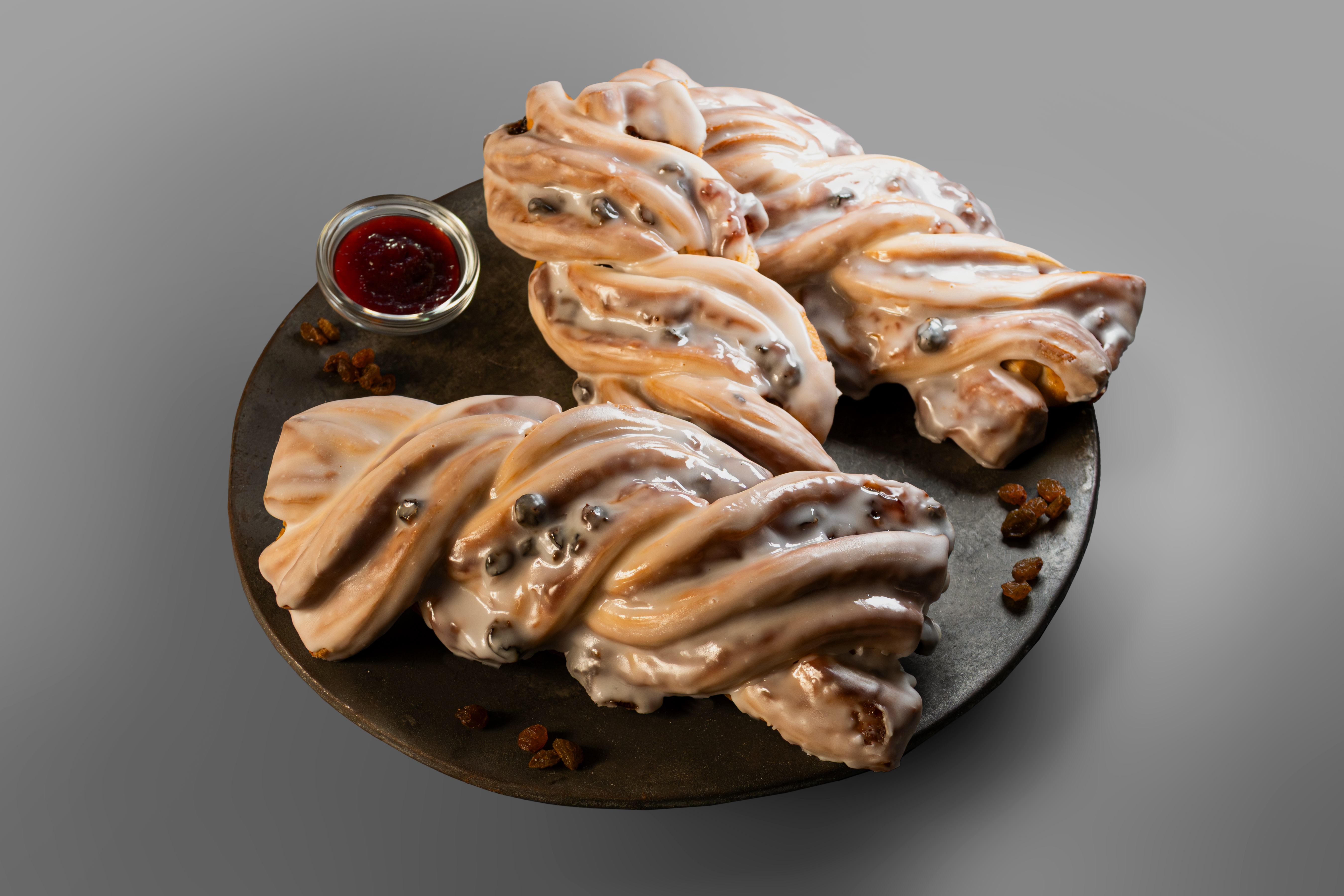 Alles von Hand gefertigt! Selbst hergestellter Plunderteig wird portioniert, mit Mehrfruchtkonfitüre bestrichen, mit Sultaninen bestreut und zum einfachen Zopf geflochten. Nach dem Backen werden die Plunderstreifen aprikotiert und mit Fondant überzogen. VEGAN