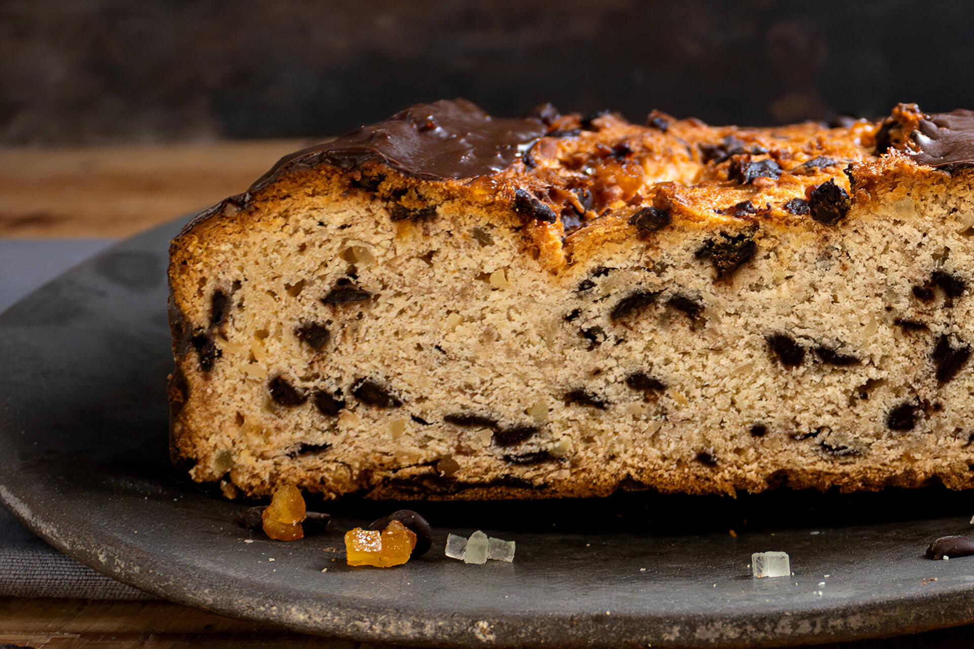 WEIZENMEHL, 12% Schokotropfen (Zucker, Kakaomasse, Kakaobutter, Emulgator: E322, natürliches Aroma), BUTTERFETT, BUTTER, Zucker, MANDELN gehackt süss, Hefe (Hefe, Speisesalz, Stabilisator: E415), Zitronat (Zedernfruchtschalen, Glukose-Fruktose-Sirup, Zucker, Säuerungsmittel: E330), Orangeat (Orangenschalen, Glukose-Fruktose-Sirup, Zucker, Säuerungsmittel: E330), MANDELNGRIESS bitter, MILCHPULVER, Zitronenschalenpaste (Zitronenschalen, Saccharose, Glucose-Sirup, natürliches Aroma), Salz, Bittermandelaroma (Aromastoffe, Bittermandelöl, Wasser, Sonnenblumeöl, Verdickungsmittel: Xanthan, Säuerungsmittel: E330, Stabilisator: E331) Dekor: Kuvertüre (Kakaomasse, Zucker, Kakaobutter, Emulgator: SOJALEZITHIN, natürlicher Vanilleextrakt), Kakaohaltige Fettglasur (Zucker; Palmfett, ganz gehärtet; Kakao, fettarm; Palmfett; Emulgator: Sonnenblumenlecitin; Aroma)
